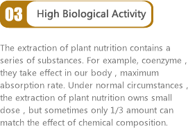 A torrent of broken technology makes the plants release nutrition, holds active ingredient, absorbs hot and cold and exploitstarget. It rejects pesticide residue, heavy metal and additive within the whole process. We knew that we can do nothing about renewing contaminated lands and air,but we can renew the plants to organic state from 100 years ago and restore you a pure and clean plant molecular.